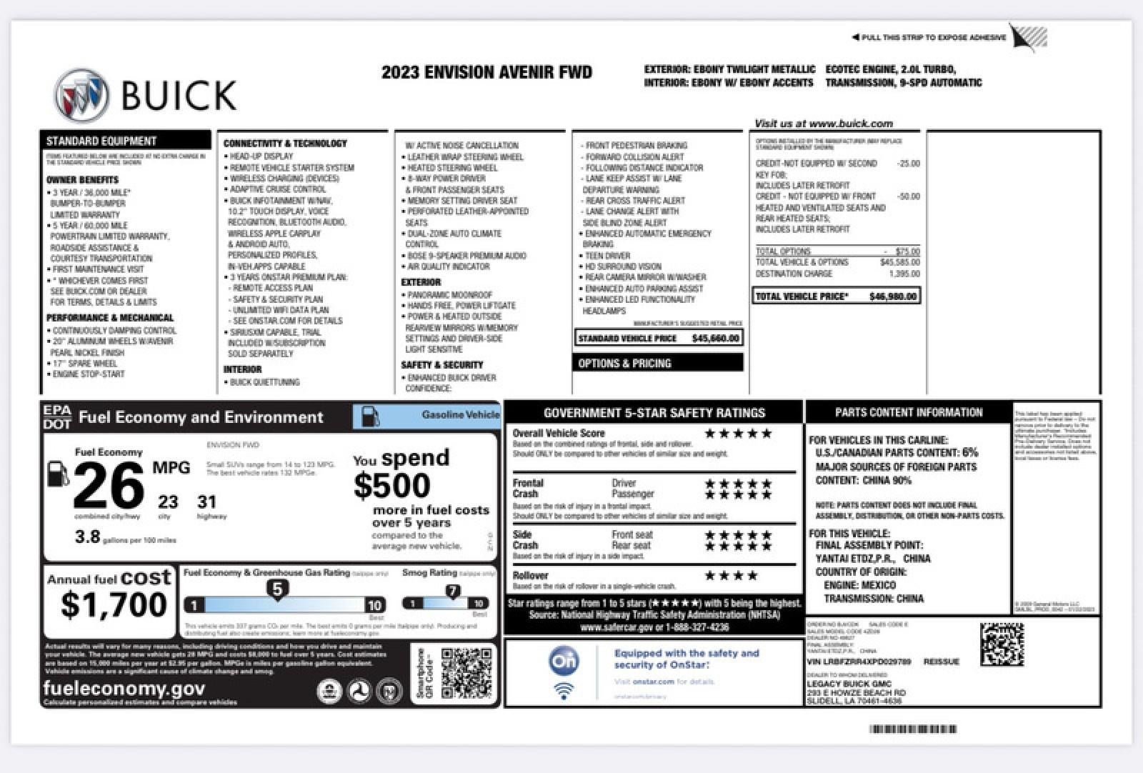 You can find this 2023 Buick Envision Avenir and many others like it at Legacy Buick GMC. This Buick Envision Avenir has a tough exterior complemented by a well-designed interior that offers all the comforts you crave. This Buick Envision Avenir's level of quality is not meant for just anyone. It's meant for the person who strives for a classy, comfortable, and luxurious car. This wonderfully fuel-efficient vehicle offers a supple ride, quick acceleration and superior styling without sacrificing MPGs. The Envision Avenir is well maintained and has just 26,500mi. This low amount of miles makes this vehicle incomparable to the competition.