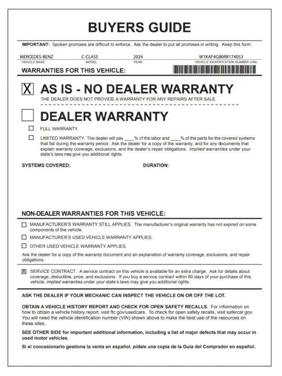 2024 Mercedes-Benz C 300 RWD AMG Line | Night Package | Polar White This 2024 Mercedes-Benz C 300 is the perfect blend of luxury, performance, and modern technologywrapped in an aggressive AMG Line with Night Package that turns heads everywhere it goes. Finished in Polar White with blacked-out accents, AMG body styling, and 19" AMG multispoke wheels , this C-Class carries a confident, sporty presence that looks just as good pulling up to a valet as it does cruising the highway. Under the hood, Mercedes 2.0L turbocharged mild-hybrid engine delivers 255 horsepower , paired with the smooth and responsive 9-speed 9G-TRONIC automatic transmission and rear-wheel drive for a refined yet engaging driving experience. Dynamic Select drive modes let you tailor the ride from comfort to sport at the push of a button. Step inside and youre welcomed by a driver-focused cockpit featuring: AMG Black interior MB-Tex sport seats with ventilation Flat-bottom AMG steering wheel Natural grain walnut wood trim 11.9 touchscreen with MBUX voice control Wireless Apple CarPlay & Android Auto Panoramic-style glass sunroof Safety and technology are fully covered with Blind Spot Assist , Active Brake Assist , Exit Warning Assist , ATTENTION ASSIST , rearview camera, and Mercedes me connected services for peace of mind on every drive. With an original MSRP of $52,585 , this C 300 delivers premium luxury, AMG styling, and cutting-edge tech at a level that rivals vehicles far above its class. Available now at Legacy Westbank Buick GMC This one wont last schedule your visit today and experience Mercedes-Benz refinement firsthand.