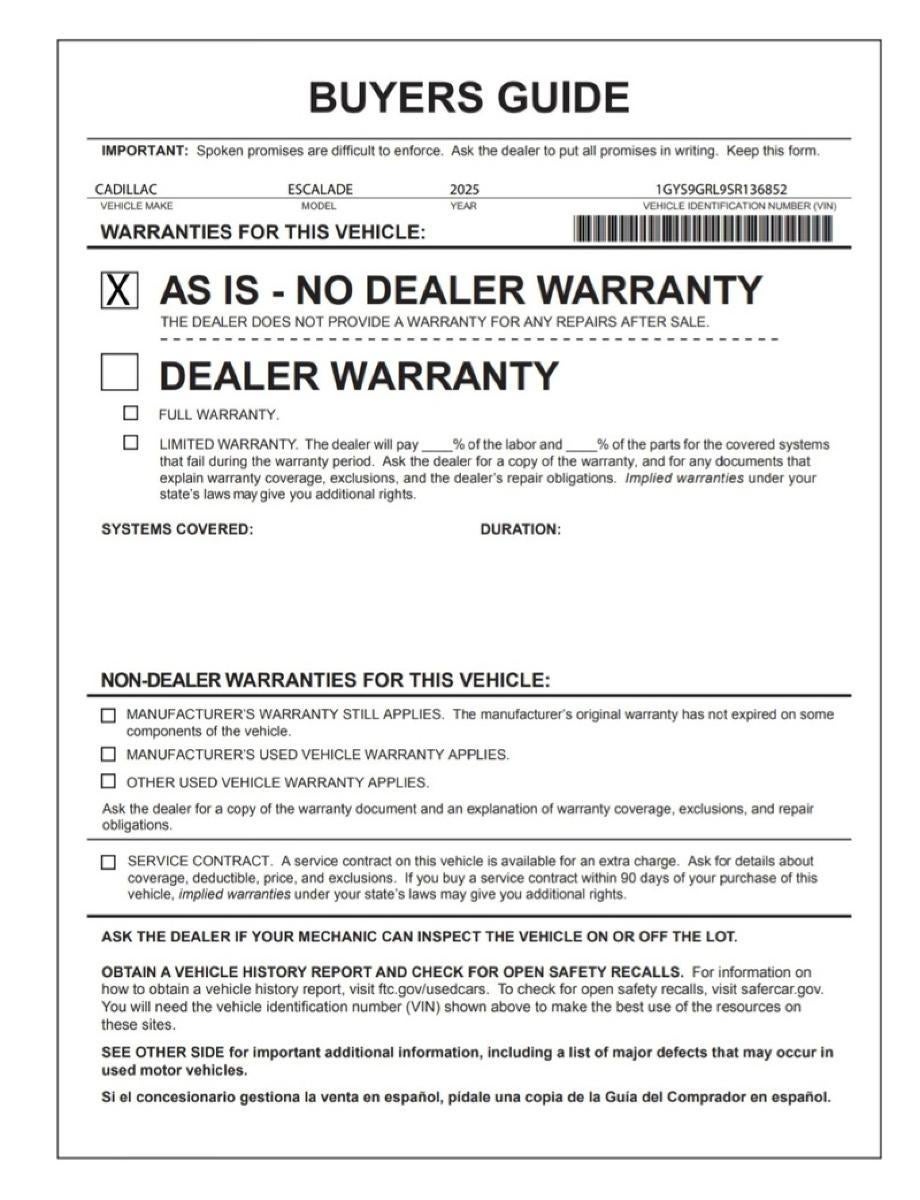 Check out this pre-owned 2025 Cadillac Escalade we recently got in. Want more room? Want more style? This Cadillac Escalade 4WD Sport Platinum is the vehicle for you. There's a level of quality and refinement in this Cadillac Escalade 4WD Sport Platinum that you won't find in your average vehicle. Do you encounter heavy snow, rain or mud when driving? No problem. With this vehicle, you've got the power of 4WD to help you overcome the toughest terrain. The quintessential Cadillac -- This Cadillac Escalade 4WD Sport Platinum speaks volumes about its owner, about uncompromising individuality, a passion for driving and standards far above the ordinary.